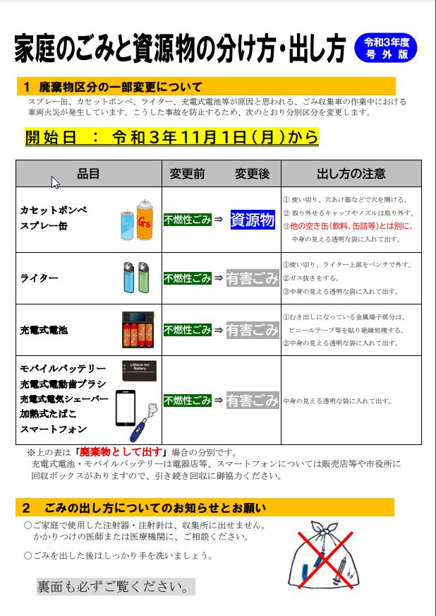 入居者へお知らせ 管理室からのお知らせ【11/2 更新】 kojima-so 2021年9月29日 / 2021年11月2日 11月2日 ごみの分け方・出し方 11月1日からごみの分け方と出し方に 一部変更がありましたのでご確認をお願いします。 10月8日 1号館に自販機ができました ジュースが70円~です。 10月6日 3号館の屋根のペンキ塗りをします 屋根からの落下物にご注意ください。 9月30日 不在のお知らせ 9月30日(木)は15時頃まで管理室が不在になります。 何かあれば15時以降にお越し下さい。