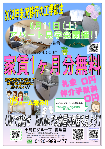 管理室日記 アパート見学会開催!! kojima-so 2022年6月7日 6/11(土)お迎え付き見学会を開催します!(^^)! 見学予約受付中です!! AM10:30 清明寮・小白川キャンパス前までお迎えに参ります。 都合が合わない場合は、平日でも大丈夫ですので お気軽にお問い合わせください✨