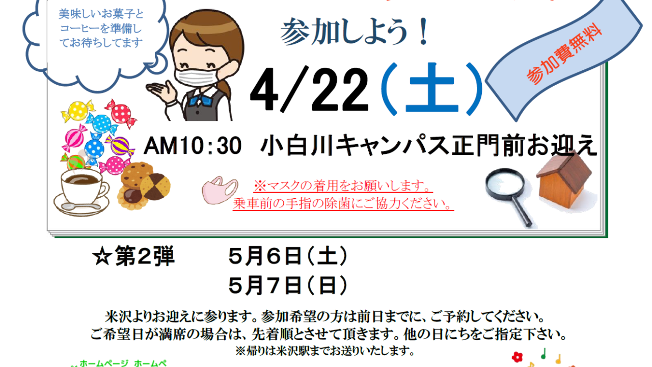 お部屋探しのお役立ち お迎え付き見学会! kojima-so 2023年4月6日 第一弾! お迎え付き見学会の開催がきまりました✨ 4/22(土) AM10:30小白川キャンパス正門前にお迎えです。 来年の米沢のアパート決めませんか? LINEからも予約できます!
