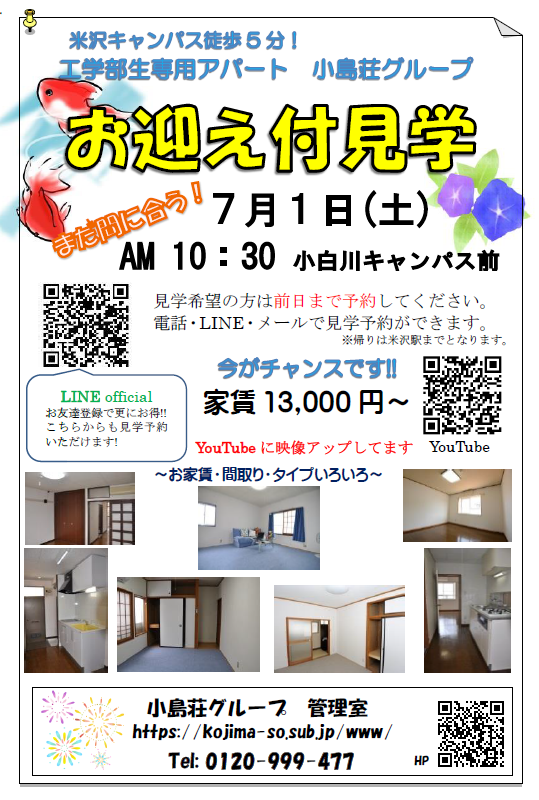 お部屋探しのお役立ち お迎え付見学会!第5弾! kojima-so 2023年6月28日 7/1(土)お迎え付見学会! 第5弾! ご予約まだ間に合います✨ LINE・メールでも見学予約可能です! お問い合わせお待ちしております😊 夏休み前に米沢のアパート決めませんか?
